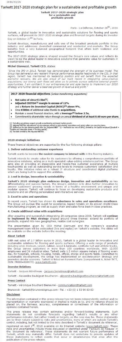 得嘉2017-2020年可持續及盈利發展戰略計劃 得嘉集團是一家提供創新及可持續發展解決方案地板及運動地面的全球領導者, 2016年10月27日得嘉集團將在投資者日在巴黎發布其2017 - 2020年戰略計劃和財務目標。