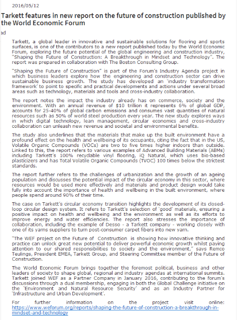 世界經(jīng)濟論壇發(fā)布得嘉對未來建設(shè)的特別報告 ![]() 得嘉, 是創(chuàng)新和可持續(xù)發(fā)展解決方案的全球地板和運動表面領(lǐng)導(dǎo)者,在2016年世界經(jīng)濟論壇與波士頓咨詢集團(Boston Consulting Group)合作貢獻一份報告:探索未來全球工程和建筑行業(yè)的潛力,“塑造未來的建筑:心態(tài)和技術(shù)突破”。 “塑造未來的建設(shè)”是行業(yè)論壇議程的一部分,商業(yè)領(lǐng)袖探索工程和建筑業(yè)如何推動可持續(xù)業(yè)務(wù)增長。研究開發(fā)了一個“產(chǎn)業(yè)轉(zhuǎn)型框架”指具體和實際發(fā)展和行動等廣泛領(lǐng)域技術(shù)、材料和工具和跨行業(yè)合作。 報告指出建筑業(yè)已經(jīng)對商業(yè)的影響,社會和環(huán)境問題。年營收為10萬億美元,占全球國內(nèi)生產(chǎn)總值(GDP)的6%,占全球碳排放的25 - 40%,消耗大量的自然資源,如每年全球鋼鐵產(chǎn)量的50%。新的研究探索的方法數(shù)字技術(shù),精益管理、循環(huán)經(jīng)濟和跨行業(yè)合作可以帶來新的收入,社會和環(huán)境效益。 研究表明材料是構(gòu)成建筑環(huán)境產(chǎn)生的深遠影響居住者的健康和福祉,并引用事實,在美國揮發(fā)性有機化合物(揮發(fā)性VOC)在室內(nèi)比外面高2 - 5倍。報告指的是各種先進的建筑材料(ABMs)的例子,其中包括得嘉是100%可回收的iQ天然塑料地板,使用生物增塑劑和總揮發(fā)性有機化合物(TVOC)低于最嚴格的標(biāo)準(zhǔn)的100倍。 報告進一步指出城市化和人口老齡化對發(fā)展的挑戰(zhàn),探討了循環(huán)經(jīng)濟的潛在影響,資源需要更有效地使用,材料和產(chǎn)品設(shè)計需要充分考慮建筑環(huán)境健康的重要性,因為人們在建筑空間花的時間為90%左右。 得嘉分享循環(huán)經(jīng)濟轉(zhuǎn)型凸顯其閉環(huán)循環(huán)設(shè)計系統(tǒng)的開發(fā)案例。它指得嘉選擇“好”材料,確保健康和環(huán)境產(chǎn)生積極的影響,以及努力提高能源和用水的效率。報告還強調(diào)了合作的重要性,包括Desso—得嘉公司的例子—密切與紗線供應(yīng)商的合作,將使用后的地毯纖維轉(zhuǎn)化為新的紗線。 世界經(jīng)濟論壇對未來建設(shè)創(chuàng)新思維和實踐可以解鎖創(chuàng)新的偉大潛力課題,提供強大的經(jīng)濟增長的同時也關(guān)注我們社會和環(huán)境的責(zé)任,Remco Teulings話,EMEA得嘉集團總裁及未來建設(shè)指導(dǎo)委員會成員。 世界經(jīng)濟論壇匯集了最重要的政治、商業(yè)和其他社會的領(lǐng)導(dǎo)人,塑造全球、區(qū)域和行業(yè)在國際會議的議程。得嘉在2016年1月加入世界經(jīng)濟論壇作為合作伙伴,以雙重會員的身份參與兩個論壇的討論:全球挑戰(zhàn)計劃對環(huán)境和自然資源安全以及一個行業(yè)合作伙伴的基礎(chǔ)設(shè)施和城市發(fā)展。